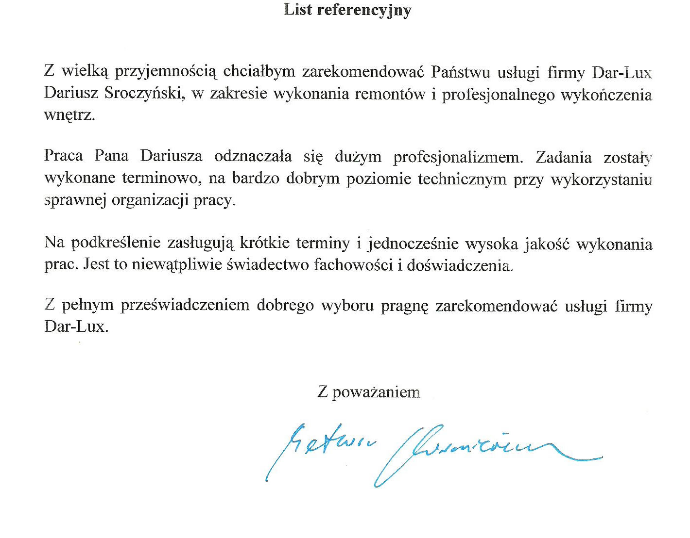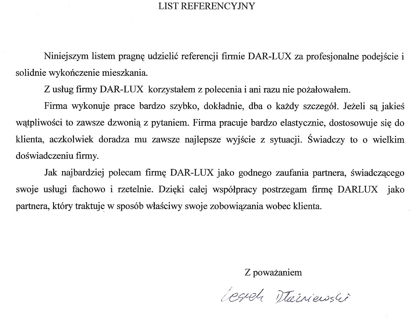 Niniejszym listem pragnę udzielić referencji firmie DAR-LUX za profesjonalne podejście i solidne wykończenie mieszkania. Z usług DAR-LUX korzystałem z polecenia i ani razu nie pożałowałem. Firma wykonuje prace bardzo szybko, dokładnie, dba o każdy szczegół. Jeżeli są jakieś wątpliwości, to zawsze dzwonią z pytaniem. Firma pracuje bardzo elastycznie, dostosowuje się do klienta, aczkolwiek doradza mu zawsze najlepsze wyjście z sytuacji. Świadczy to o wielkim doświadczeniu firmy. Jak najbardziej polecam firmę DAR-LUX jako godnego zaufania partnera świadczącego swoje usługi fachowo i rzetelnie. Dzięki całej współpracy postrzegam firmę DAR-LUX jako partnera, który traktuje w sposób właściwy swoje zobowiązania wobec klienta.Z poważaniem