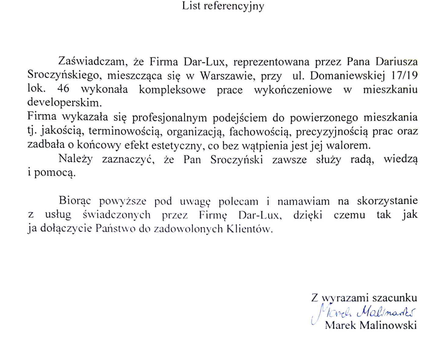 Zaświadczam, że firma DAR-LUX, reprezentowana przez Pana Dariusza Sroczyńskiego, mieszcząca się w Warszawie przy ulicy Domaniewskiej 17/19 lok 46 wykonała kompleksowe prace wykończeniowe w mieszkaniu deweloperskim. Firma wykazała się profesjonalnym podejściem do powierzonego mieszkania, to jest jakością, terminowością, organizacją, fachowością, precyzyjnością prac oraz zadbała o końcowy efekt estetyczny, co bez wątpienia jest jej walorem. Należy zaznaczyć, że pan Sroczyński zawsze służy radą, wiedzą i pomocą. Biorąc powyższe pod uwagę, polecam i namawiam na skorzystanie z usług świadczonych przez firmę DAR-LUX, dzięki czemu tak jak ja dołączycie Państwo do zadowolonych Klientów.Z wyrazami szacunku